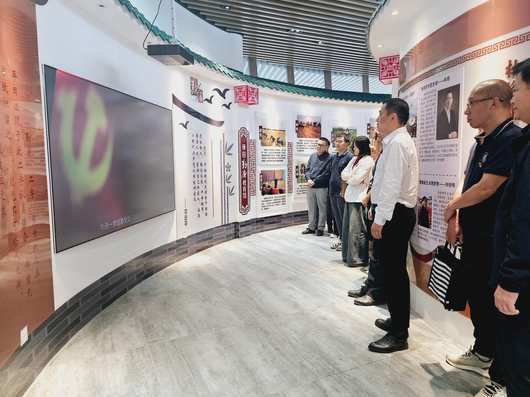 江宁区溪田勤廉教育基地是南京首家以服务党员干部加强作风建设为主题的廉政教育基地。在勤廉教育馆,党员们现场观看了生动的图片展示和教育视频,并通过解说员的讲解,学习了党和国家领导人的重要讲话、反“四风”金句、江宁本地人优良作风事迹和廉政基地宣传片等,在声光电的氛围里汲取廉政思想与清廉意识,继承和发扬党的优良传统和作风,深刻领悟老一辈革命家勤俭持家的高尚品格;在廉政馆,全体党员们一起观看了微电影《廉政中国》,通过以案说纪、以案说法、以案说责,推动党员干部引以为戒、醒悟知止,强化底线思维,切实做到防微杜渐、警钟长鸣;在宣誓长廊,院党委书记戴军带领全体党员重温入党誓词,进一步感悟入党初心和使命。