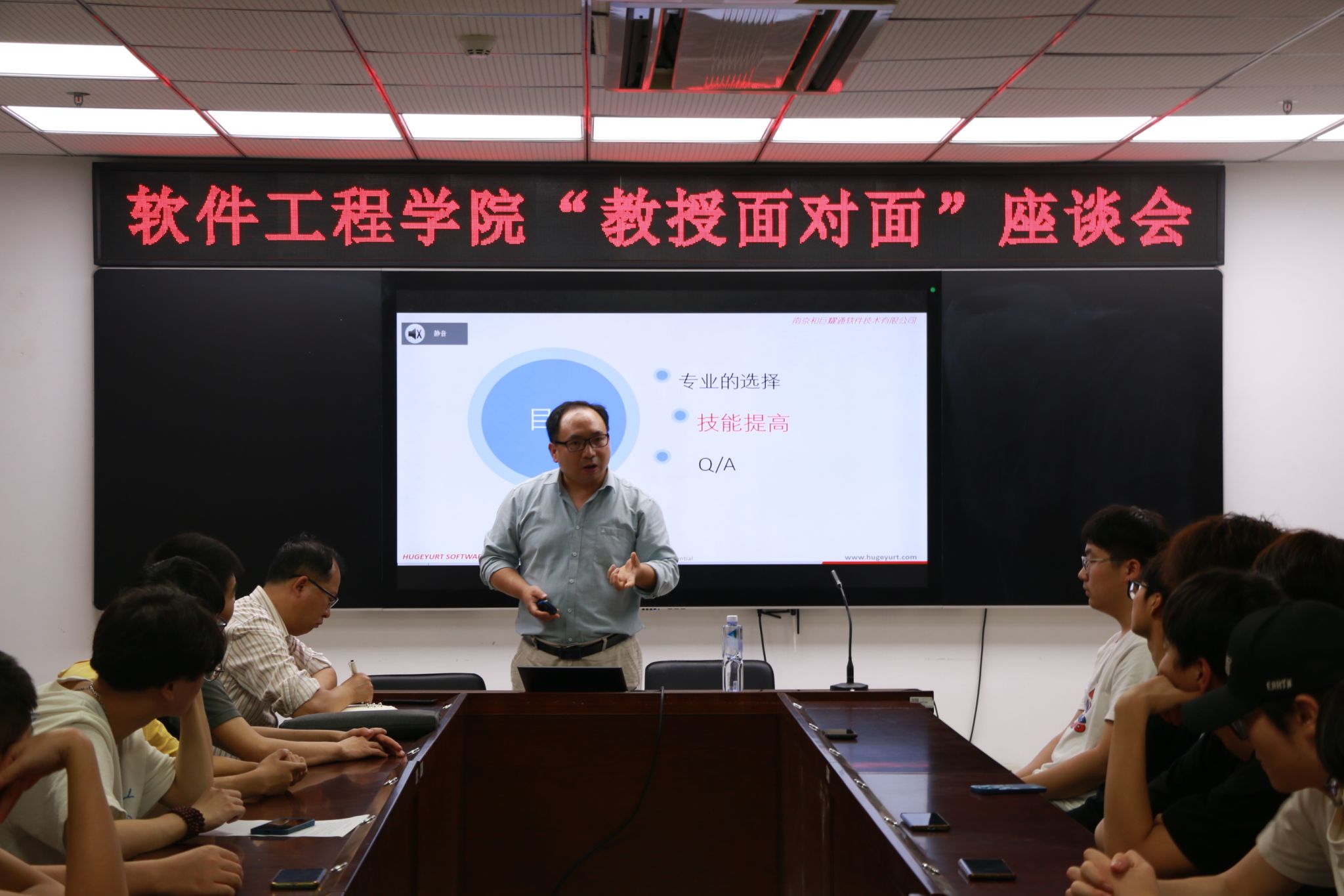 本次座谈会邀请到了南京和巨耀通软件技术有限公司技术部总经理钱海忠博士,他从企业定位及公司在智慧城市信息化建设领域、数据治理产品等应用软件产品与开发、技术服务等业务方面做了详细介绍;通用软件开发工程师的岗位职责、岗位要求;Java后端工程师具备的技能栈等内容。并表示希望以此次交流为契机,与学院在人才培养、学生实习、产教融合等方面进行深度的合作。最后他建议参会学生确定一个实际项目作为综合练习与实践目标,尽早提升个人求职竞争力。