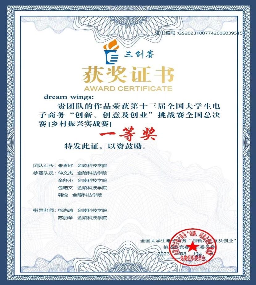 2023年3月,dream wings团队参加校内选拔赛,成功晋级路演答辩环节,最终获得“校赛一等奖”和“最佳创业奖”。6月,dream wings团队代表万象城官网在南京邮电大学参加江苏省省赛,成功斩获省赛一等奖。之后,dream wings团队不断打磨PPT与演讲稿,最终在7月dream wings团队代表学校参加全国总决赛,荣获全国一等奖。