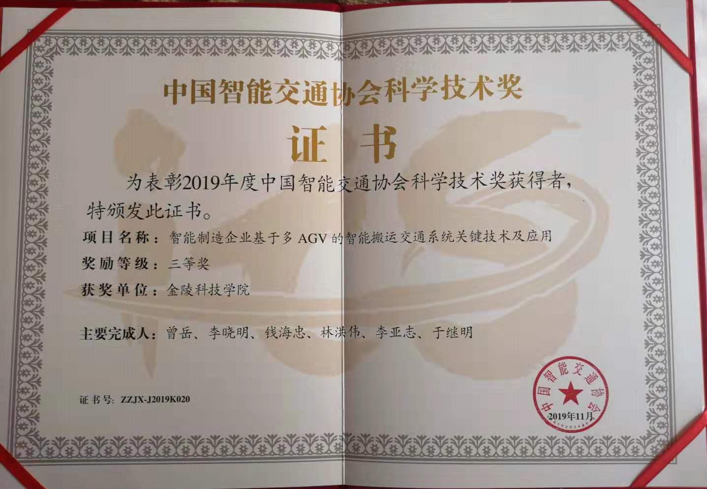 2019年度中国智能交通协会科学技术奖颁奖仪式在青岛银沙滩温德姆至尊酒店举办。万象城官网软件学院曾岳教授作为第一完成人,及其团队共同完成的“智能制造企业基于多AGV的智能搬运交通系统关键技术及应用”获评三等奖